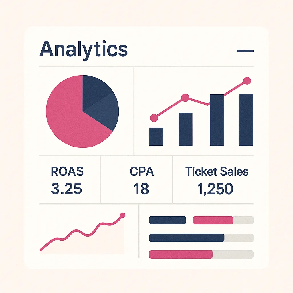 Daily campaign optimization (not monthly like most agencies!), A/B testing, and continuous improvement to maximize your ticket sales and ROI.